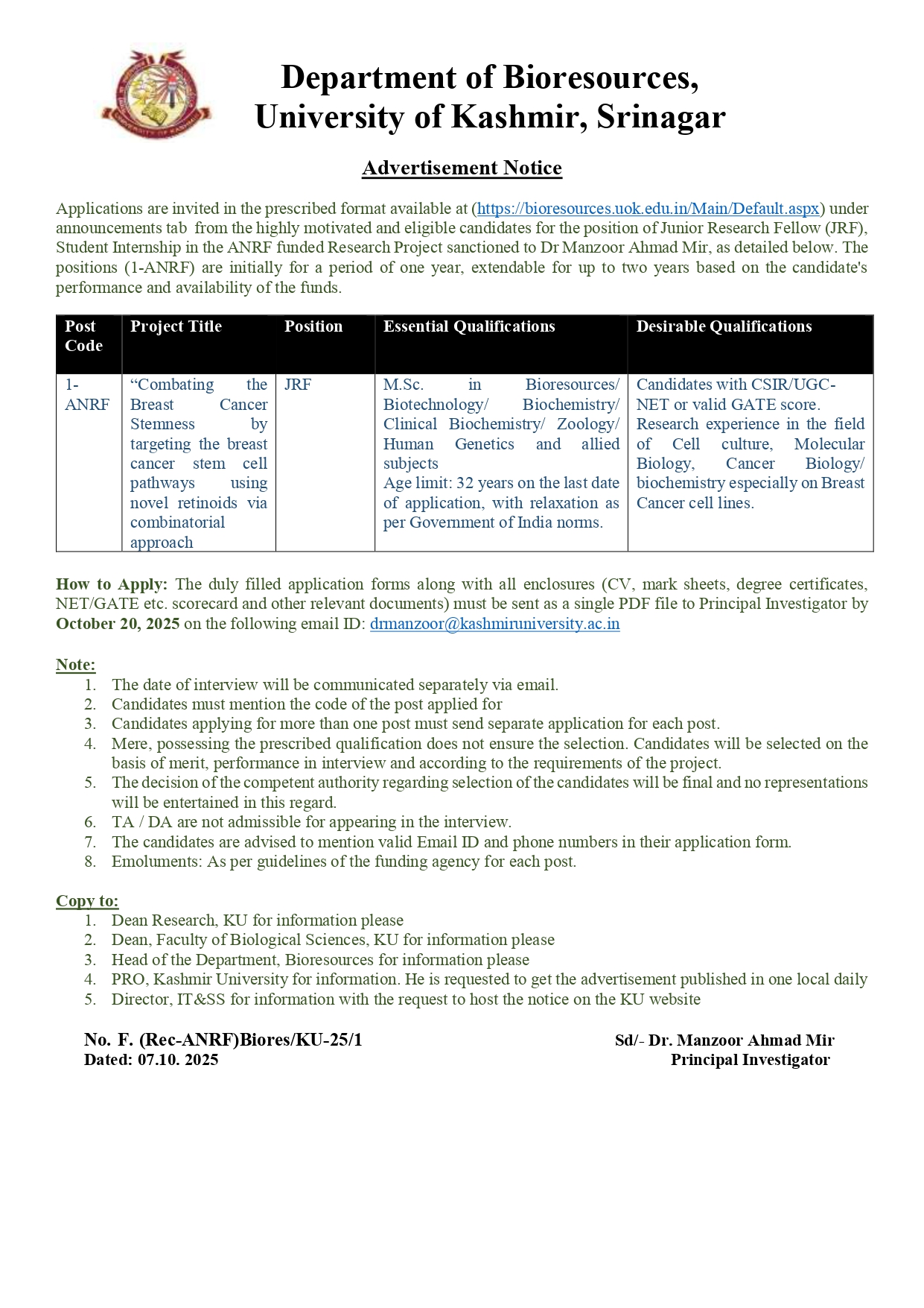 Advertisement for the post of JRF and Internship in the ANRF funded Research Project sanctioned to Dr Manzoor Ahmad Mir View